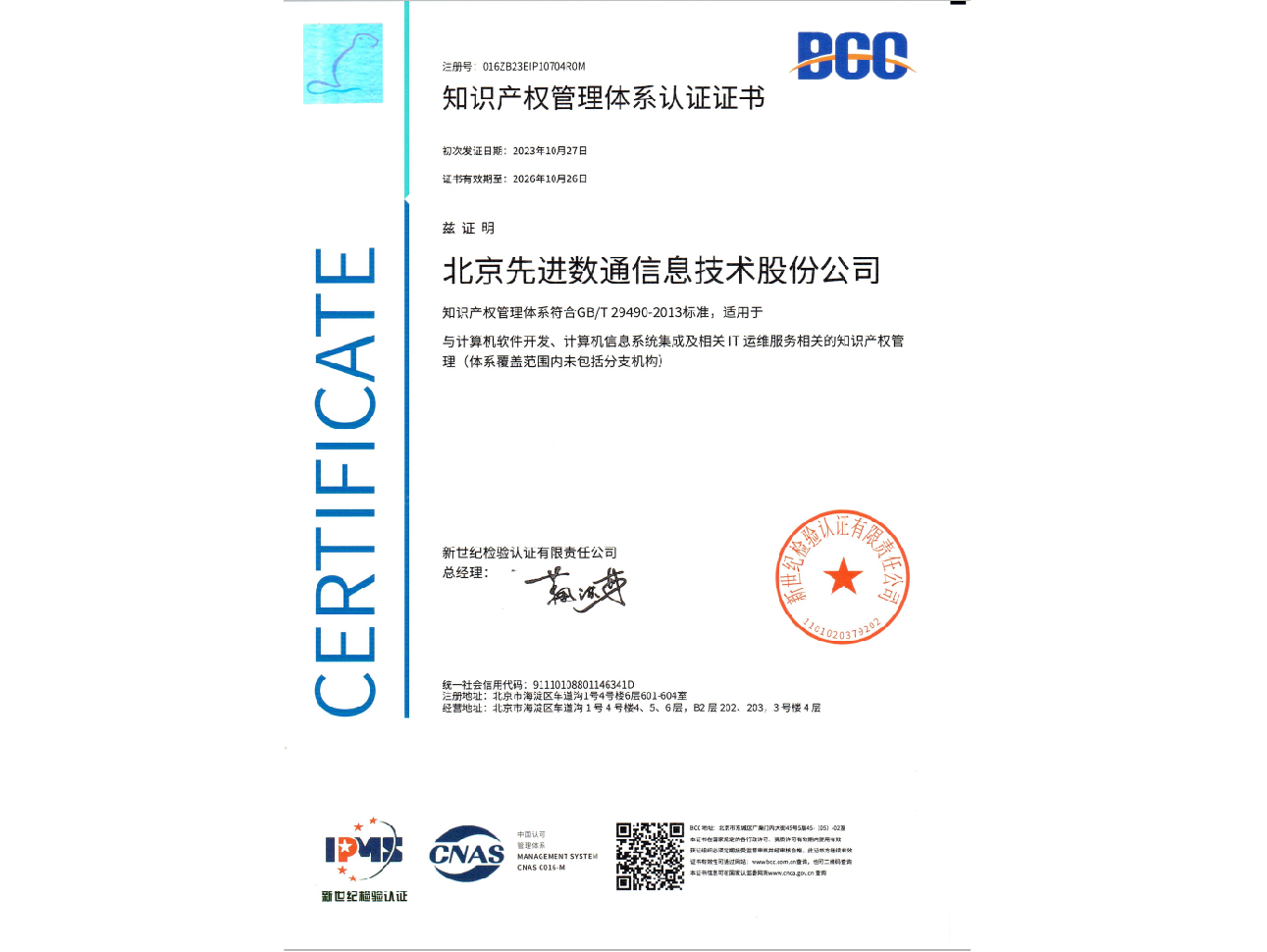 • 知识产权管理体系认证证书