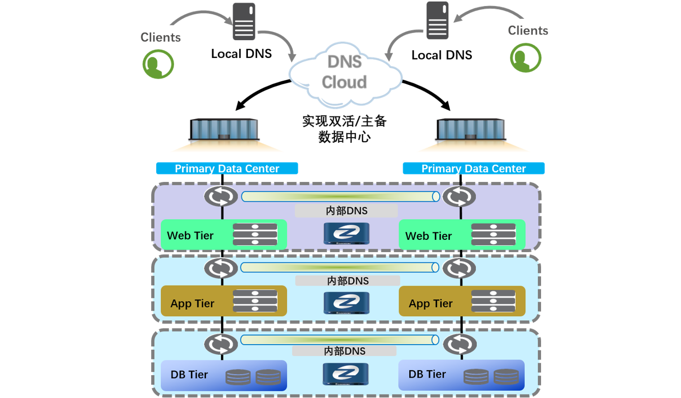 数据中心为提高应用系统的可靠性,实现多站点资源分布式部署,提高资源的利用率,需要多站点的应用系统构建成多活或主备工作模式。为了与IP地址解耦,通常会使用域名系统(DNS)来调度这些应用。bti必一体育(b-sports)多数据中心域名(DNS)解决方案以IT整体架构为蓝图,以业务陆续在性保障为目标,利用域名解析门户应用调度功能,可将用户访问流量引流到可靠、可用的数据中心进行访问,既能保证用户的使用体验,又能达到应用容灾的无感切换的目的。